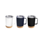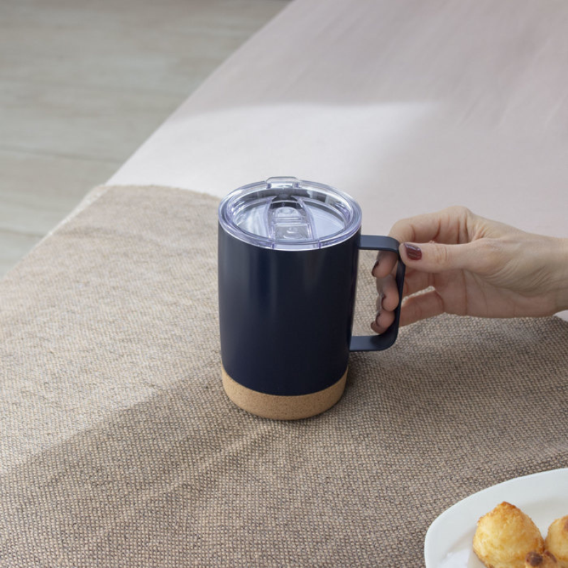 Mug Térmico con asa, doble pared, sellado al vacío. Con aislamiento térmico. Tecnología vacuum. Interior y exterior en acero. Tapa con anillo de silicona. Asa metálica. Base de corcho. Pintura acabado semi mate. Mantiene hasta 12 hs la temperatura de las bebidas calientes y 24 hs de las bebidas frías. Personalizado con logo.